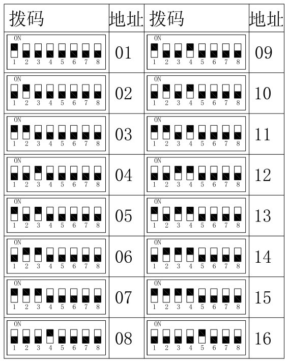 注意:撥碼1在OFF,撥碼2~8在ON,此時LED模組的地址是1;撥碼2在OFF,撥碼1,3~8在ON,此時LED模組的地址是2;以此類推,如圖5.2;